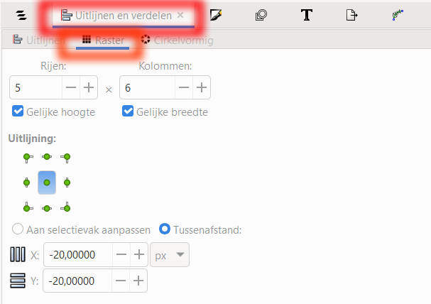 - Kies in het menu: Object - Uitlijnen en verdelen - geef de waarden in zoals bijv. voor onderstaand voorbeeld