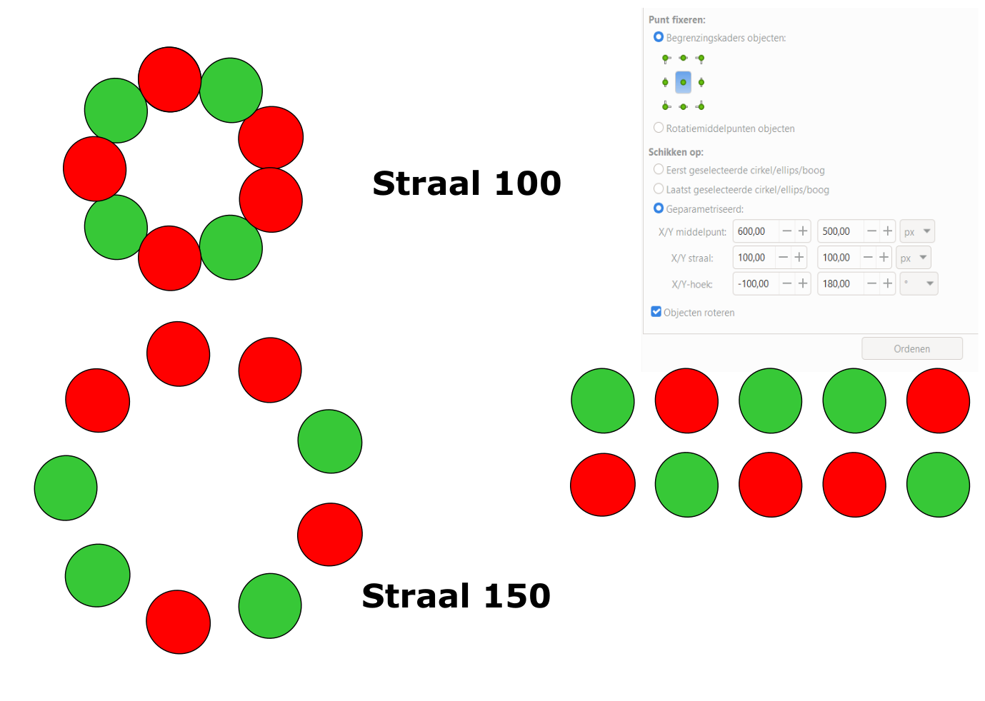 Ook de grootte en het draaipunt zijn van invloed op het resultaat en de volgorde bij meerkleurige cirkels ea