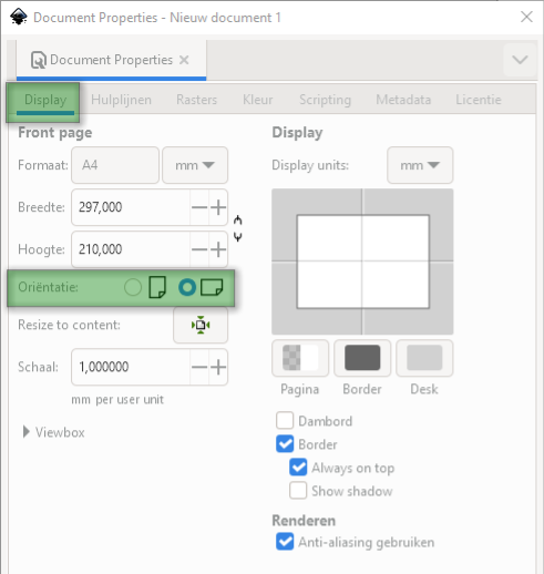 - Hier kan je de keuze voor Landscape of Portrait aanpassen alsmede de afmetingen