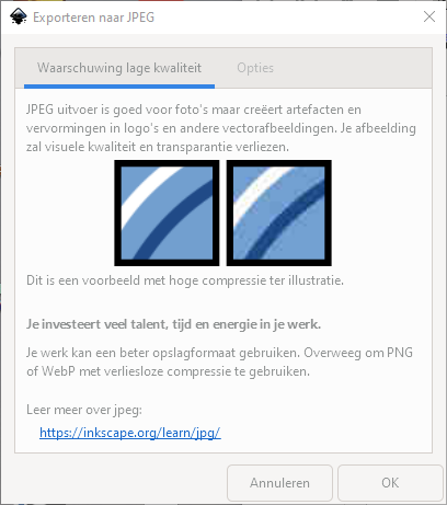 - Opties bij JPG formaat krijg je een waarschuwing over kwaliteitsverlies
